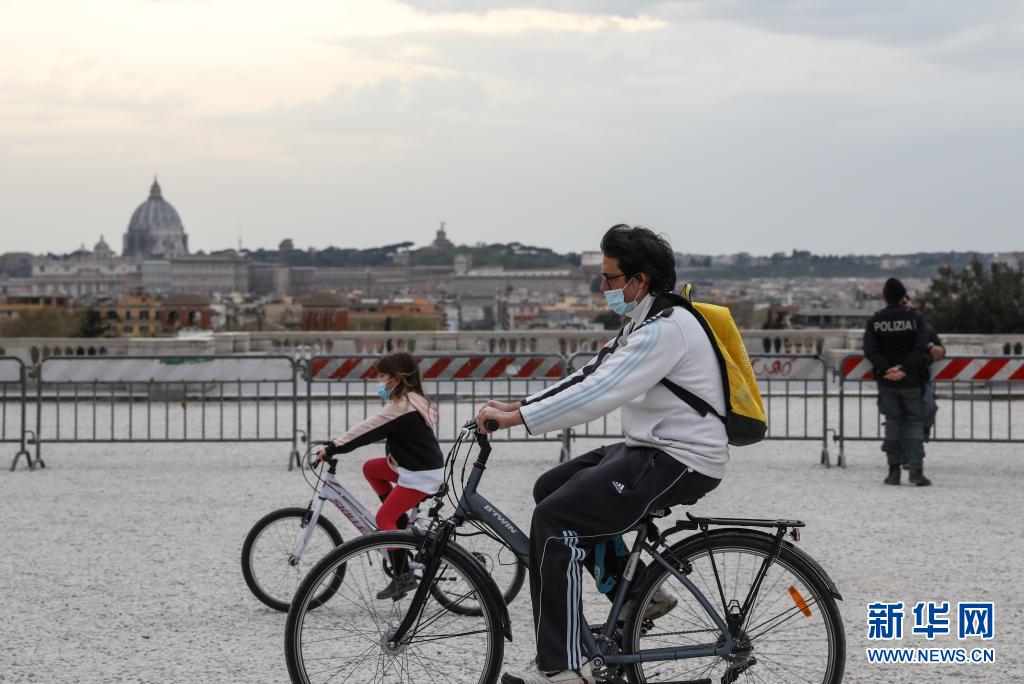 4月3日,人們騎車經(jīng)過(guò)意大利羅馬的蘋丘觀景臺(tái)。