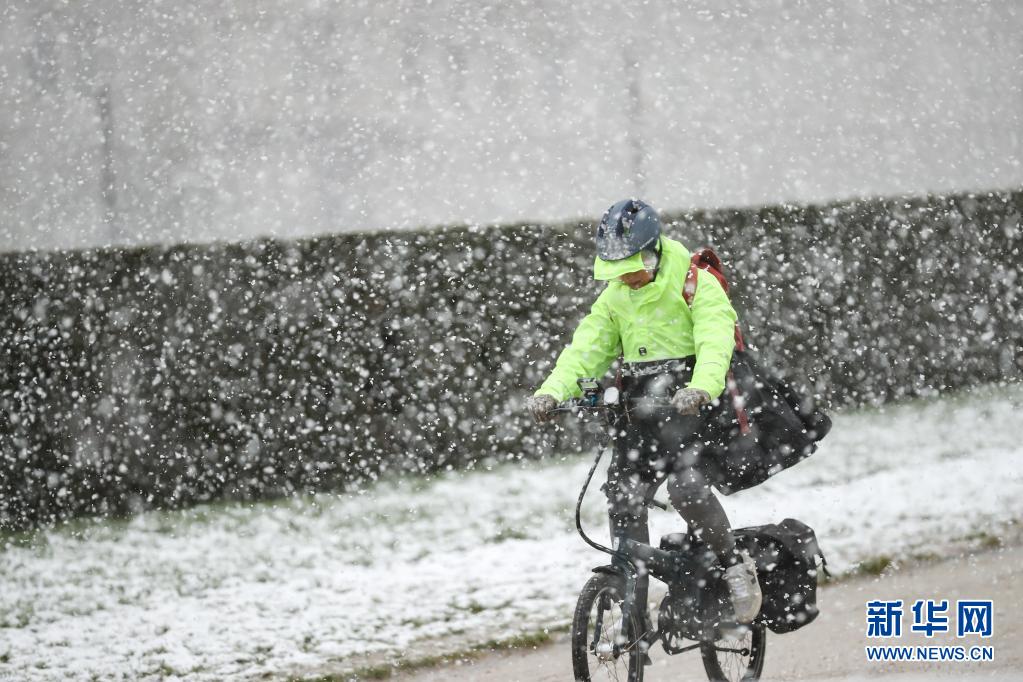 4月6日,一名市民在比利時布魯塞爾五十周年紀念公園冒雪騎車。
