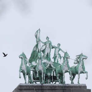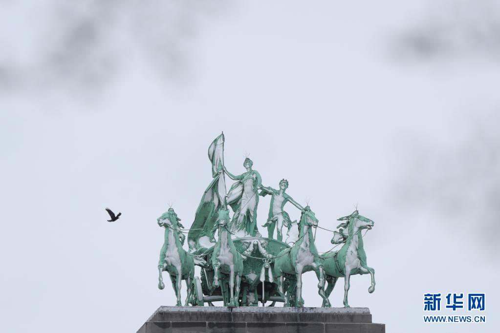 4月7日,比利時布魯塞爾五十周年紀(jì)念公園中央拱門上的雕塑被積雪覆蓋。