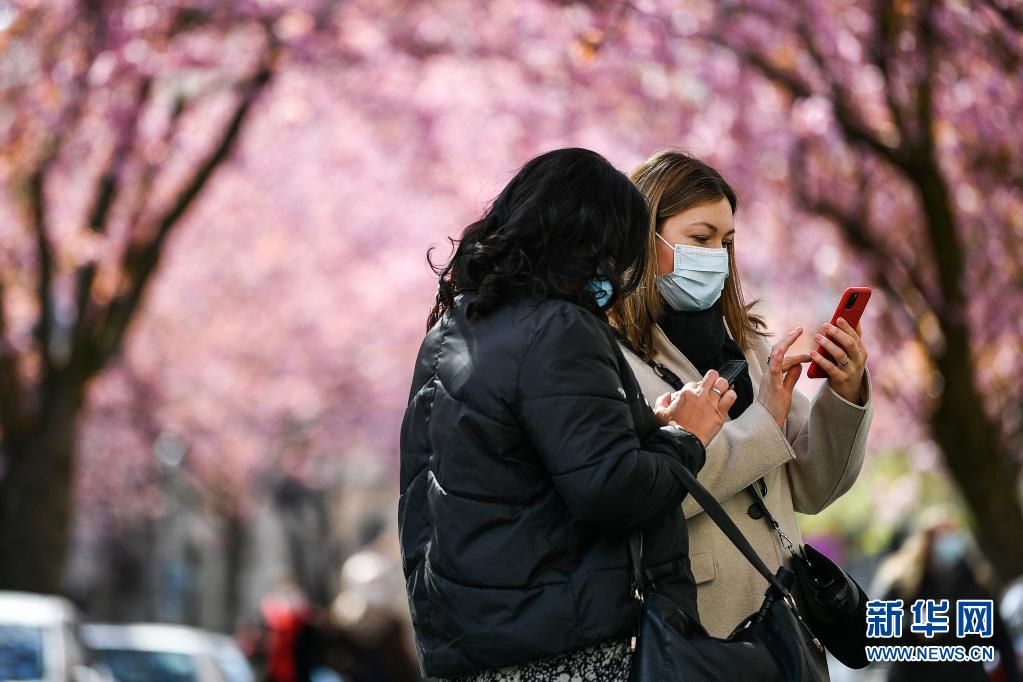 4月13日,兩名游人在德國(guó)波恩老城區(qū)用手機(jī)拍攝盛開的櫻花。