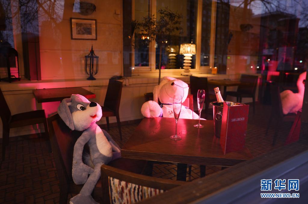 4月13日,波蘭首都華沙一家餐館將動(dòng)物玩偶擺放在靠窗座位上吸引顧客。