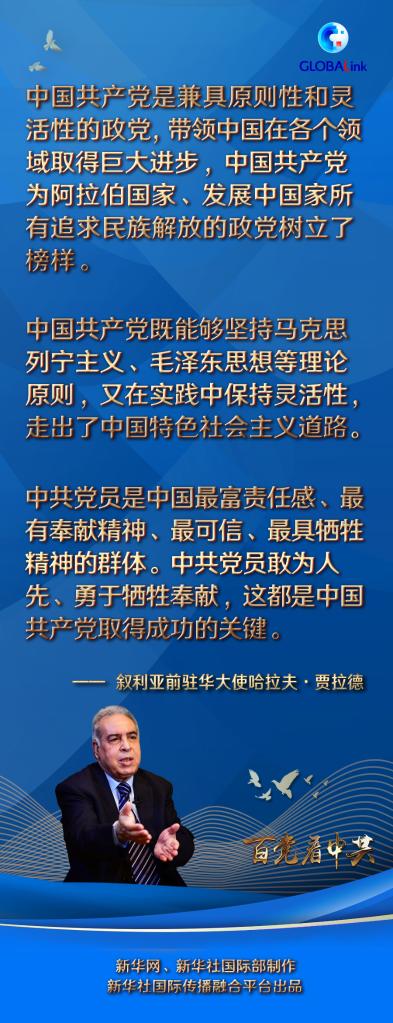 新華社大馬士革6月3日電(記者汪健 鄭一晗)敘利亞前駐華大使哈拉夫·賈拉德日前在大馬士革接受新華社記者專訪時說,中國共產(chǎn)黨是兼具原則性和靈活性的政黨,帶領(lǐng)中國在各個領(lǐng)域取得巨大進(jìn)步,“中國共產(chǎn)黨為阿拉伯國家、發(fā)展中國家所有追求民族解放的政黨樹立了榜樣”。