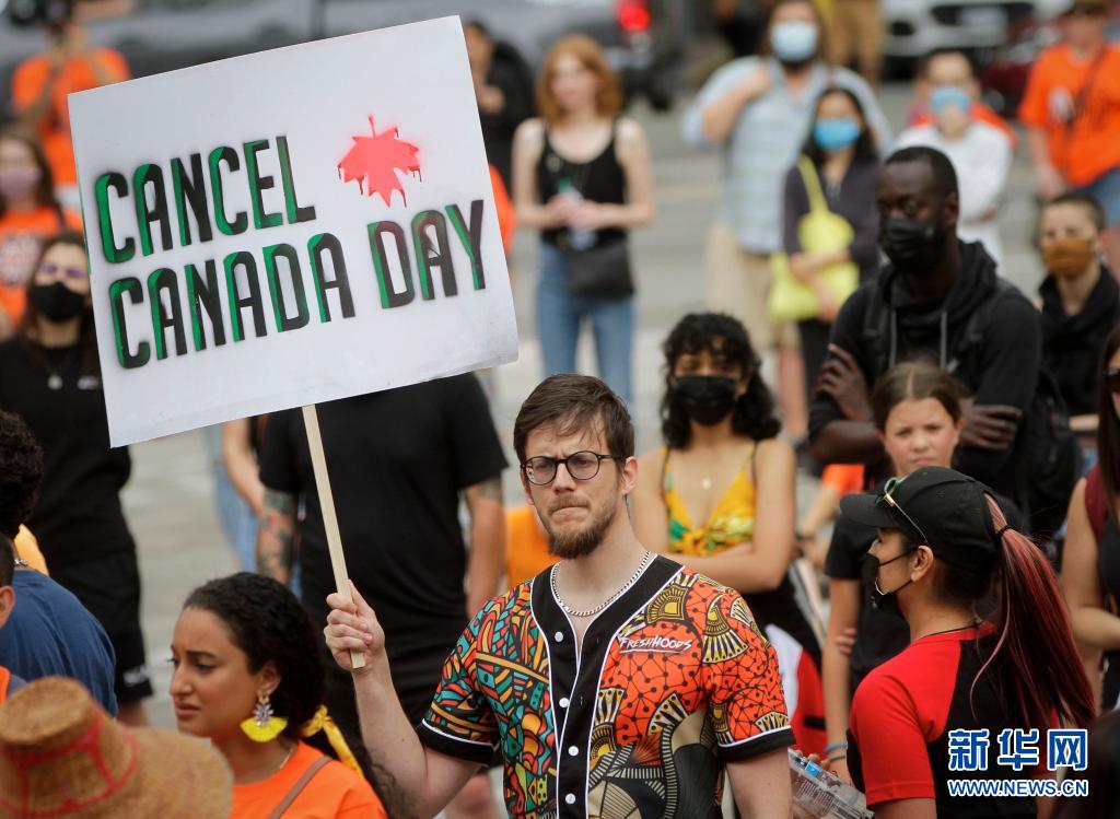 當(dāng)天是加拿大日,上千名抗議者在溫哥華集會(huì),悼念加拿大在強(qiáng)制“同化”原住民過(guò)程中遭到殘害的兒童,呼吁取消加拿大日的慶祝活動(dòng)。