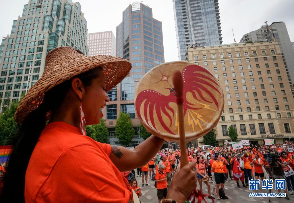 7月1日,原住民社團(tuán)成員在加拿大溫哥華舉行的集會上敲響原住民文化圖案的手鼓。